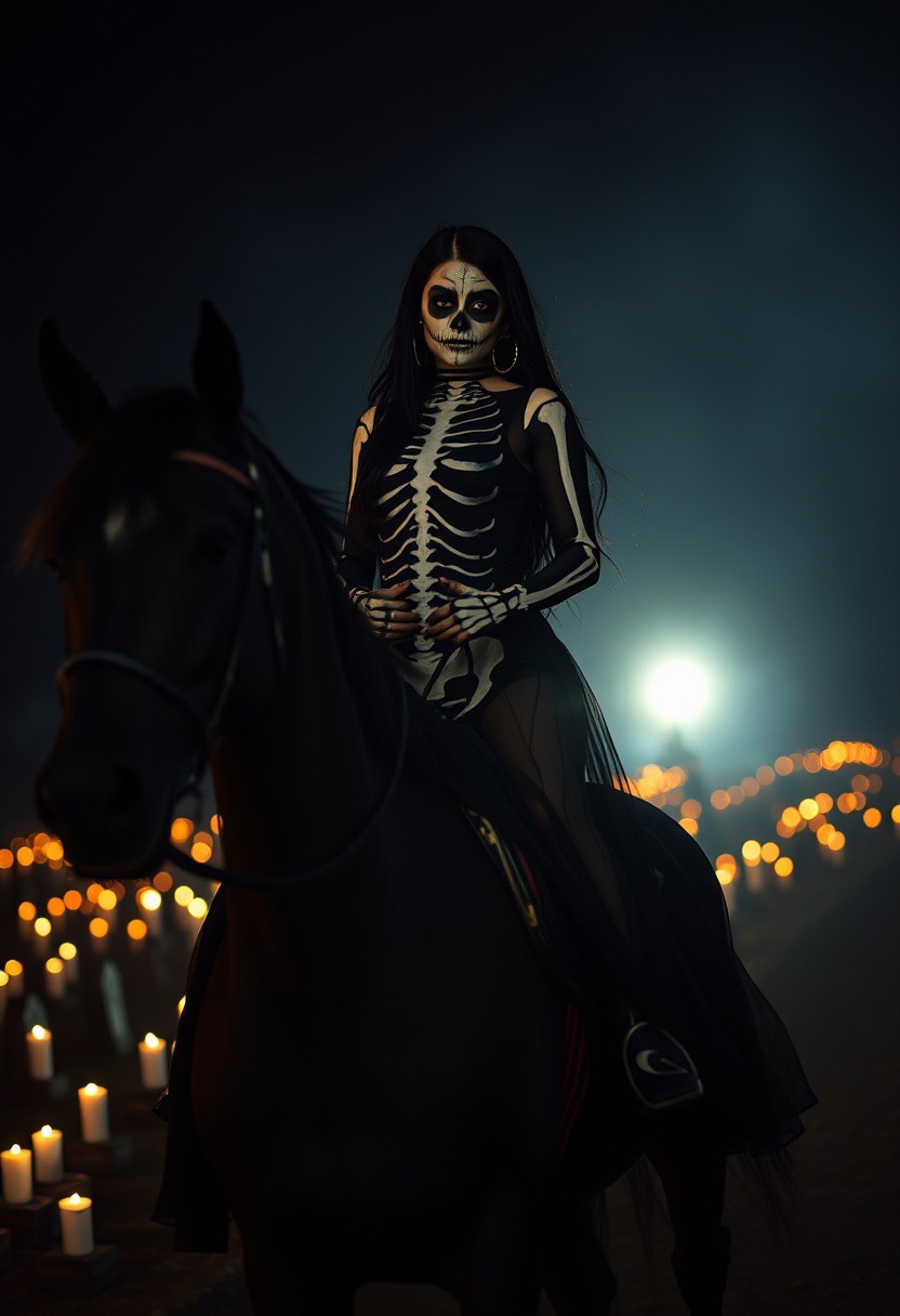 (masterpiece, best quality), score_9, score_8_up, score_7_up, masterpiece, 4k, Latina girl, alternative, long black hair, bedroom eyes, wide hips, flowing sheer black dress, dia de los muertos makeup, painted skeleton body paint, galloping on a black horse with skeleton body paint in a cemetery at night, candles everywhere, dark background, vignette, dynamic lighting, dynamic shadows, bokeh, low light, depth of field, highly detailed, high contrast, film grain, Rim Lighting,