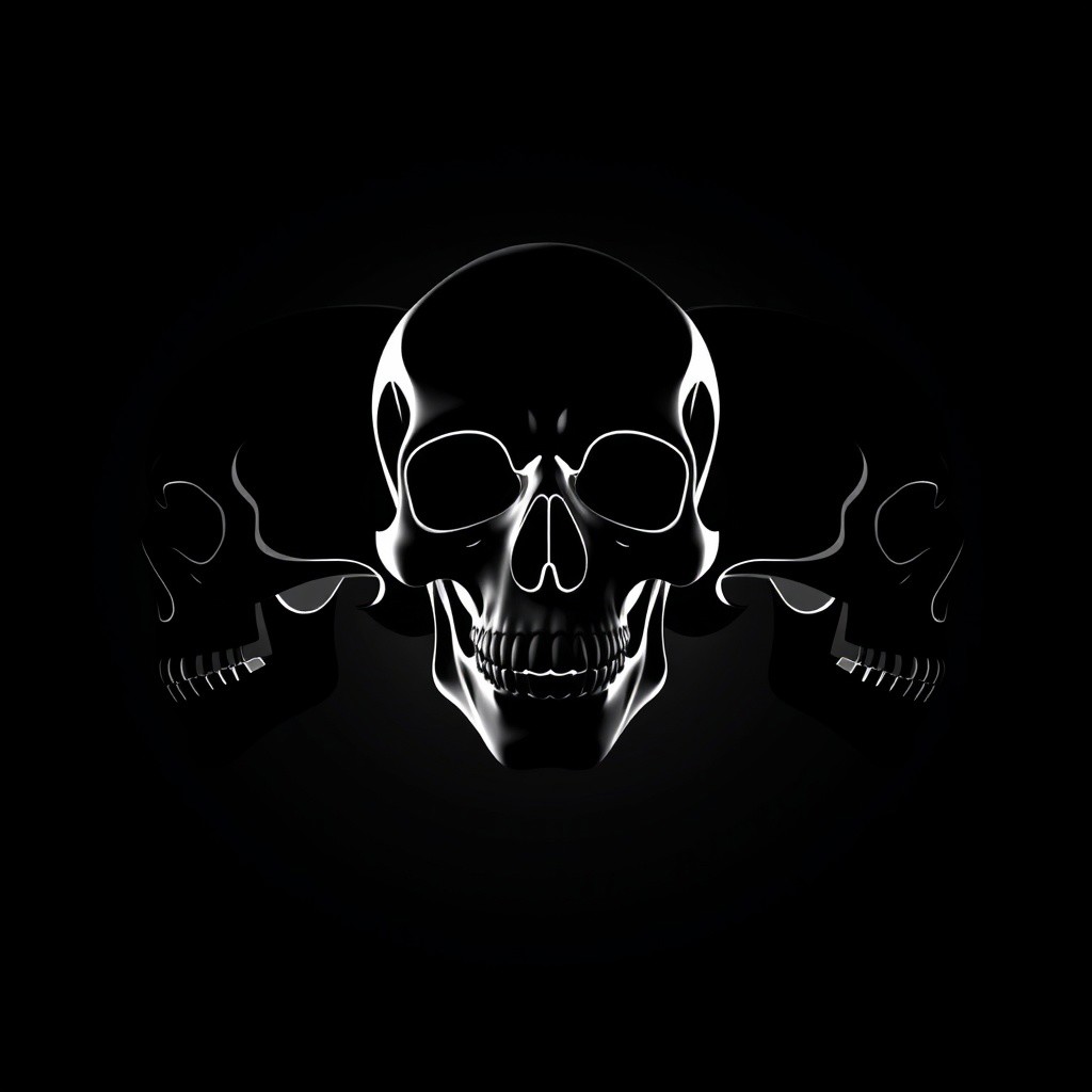 Three skulls, silhouettes, see no evil, hear no evil, speak no evil, all facing different directions, all connected into one