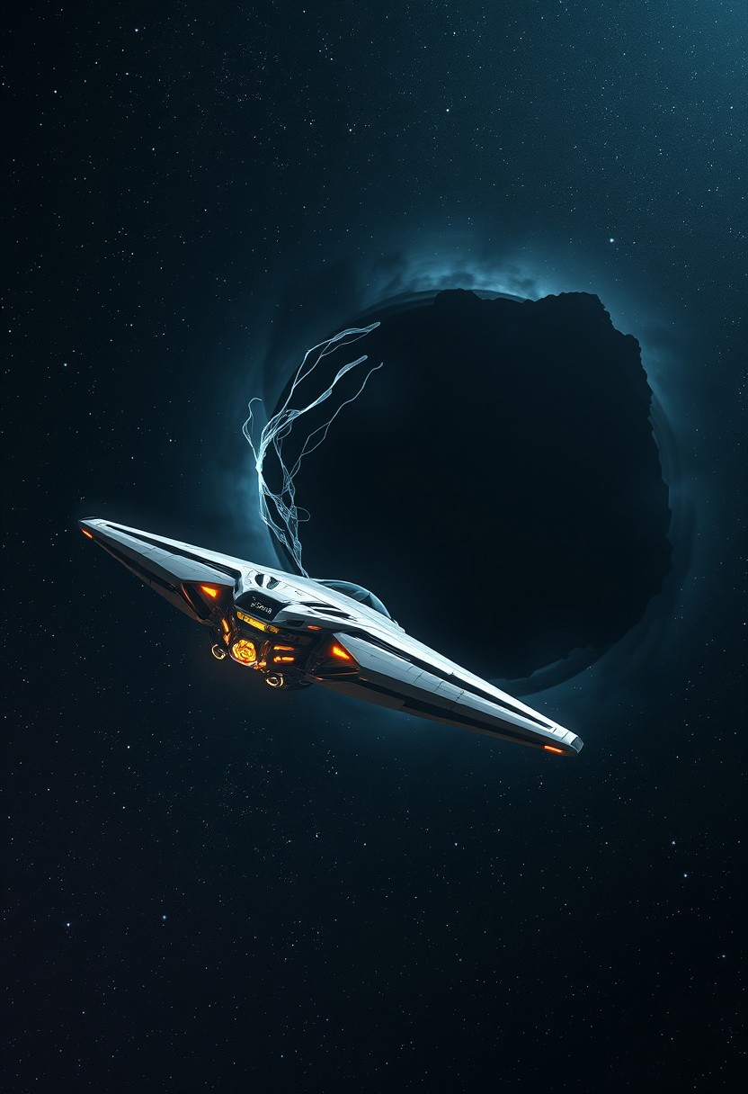 A technologically advanced space colony drifts in the darkness of space, with a massive black hole looming in the distance among shimmering stars. The colony boasts sleek lines, futuristic technology, and glowing elements, creating a mesmerizing sight that combines innovation with elegance. This visually striking image, perhaps a digital painting or CGI rendering, captures the marvel of humanity's progress in the vast cosmic expanse.