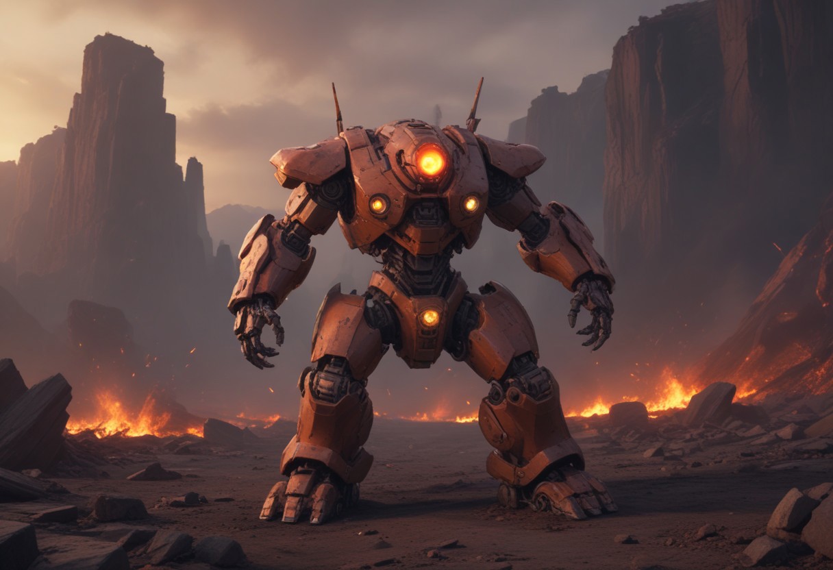 Create an official image of a robot with a data avatar inspired by Hephaestus, set against a burning land background with crimson darkness. The robot should be made of red iron oxide, with a stocky and strong appearance, and have insane details and an epic scale. The image should be in 4K resolution, with ultra-high detail and photorealistic quality, and should resemble concept art by Ernest Khalimov. The rendering should be done using Octane Render and Unreal Engine, with hyperrealistic effects and strong shadows. The final output should be a low-resolution thumbnail, similar to an eBay listing, that captures the dynamic movement of the robot as if someone is dancing.