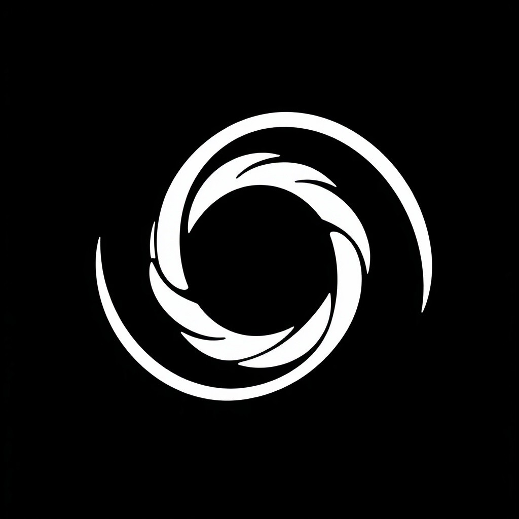 (stylized logo, emblem, vector art), (spiral in the form of a circle), (solid colors, thick-linework), white outline, black background, spiral in the form of a circle symbol white in the center, heraldic, black background, HDR, UHD,