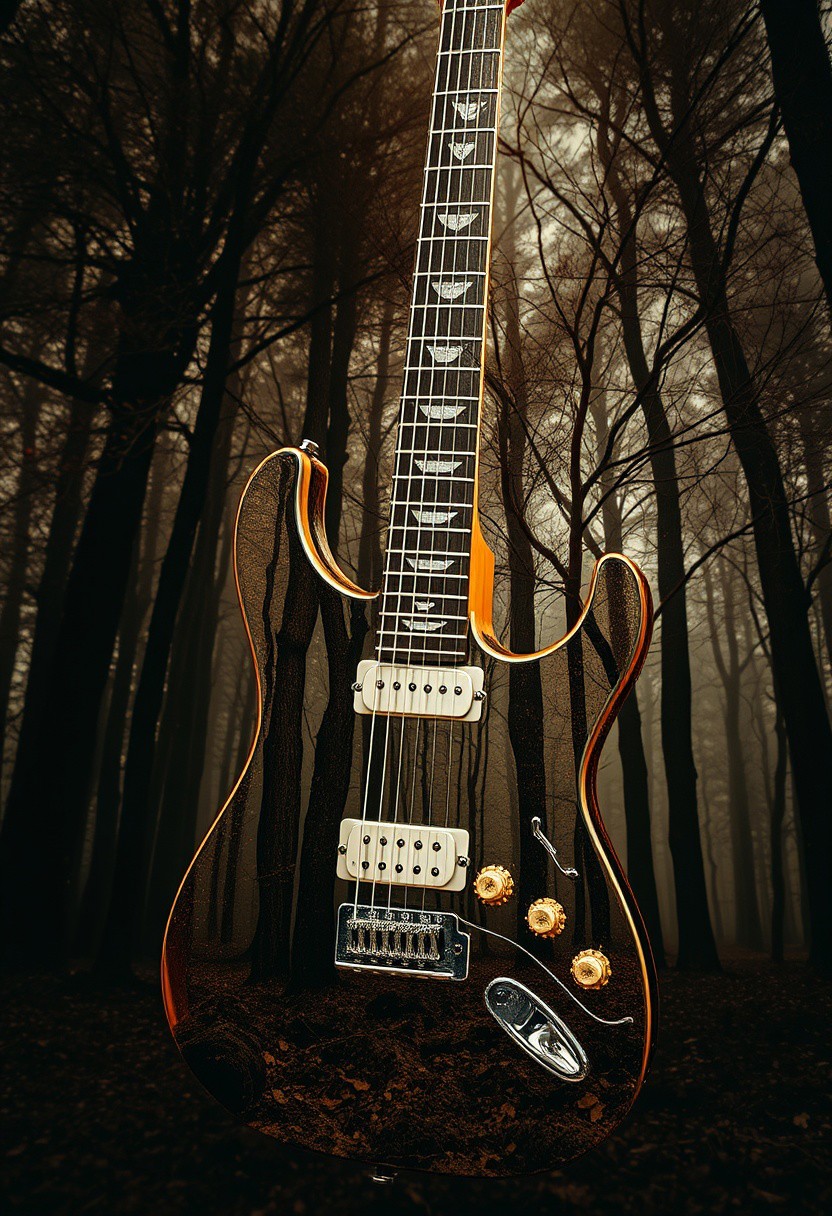 Natural earth tones, eerie, creepy atmosphere. Double exposure of a glass electric guitar and a deep-colored magical forest. Hyperdetailed, hyperrealistic, no background. High resolution, dark tones, browns, beiges, muted colors. Mythical, majestic, elemental theme.