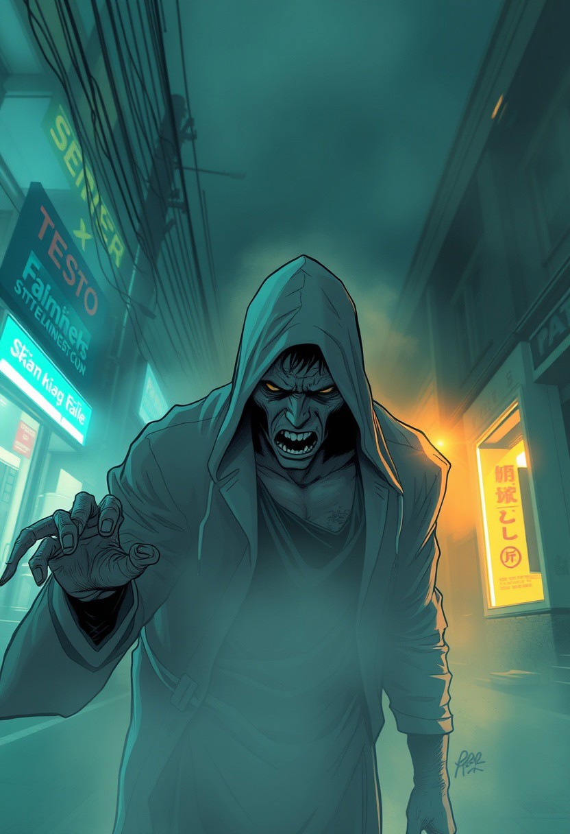 A long-exposure photograph depicting an urban legend's despair, creating a soft, dreamy atmosphere. Hazy, soft light, captures motion or light trails, with clean linework, bold colors, precise ink strokes, strong contrasts, and intense expressions in a comic book style.