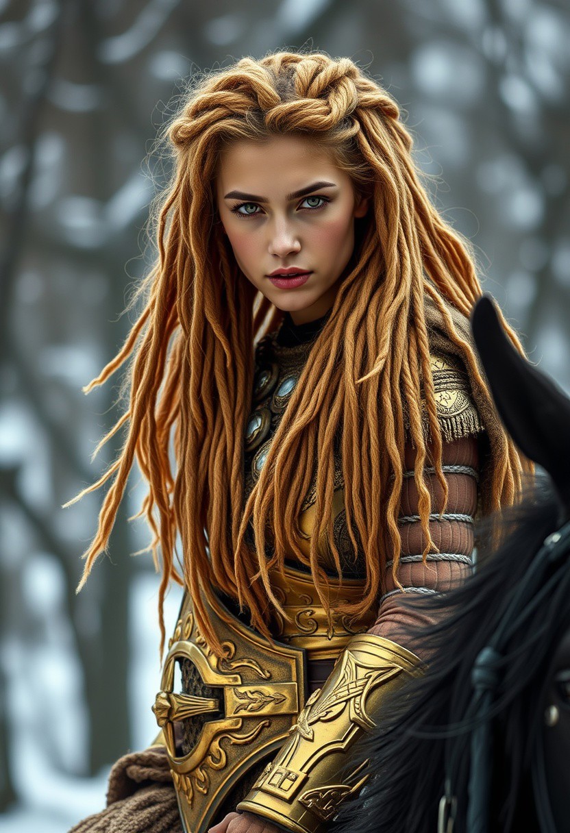 Latina girl, golden hair, gold eyes, golden eyes, ,dreadlocks, lots of hair, golden dreadlocks, Viking girl, Viking themed background, snowy background BREAK, Dramatic lighting, girl riding black horse, horse on back 2 legs girl on horses back, girl has gold eyes, BREAK, huge natural tits, girl has skimpy gold armor BREAK, big natural boobs, beautiful face, massive tits, thin waist big ass, massive realistic boobs