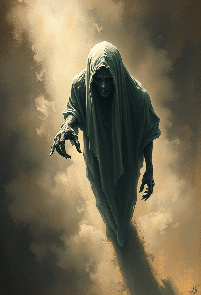 A classic oil painting in an overhead bird’s-eye view, depicting a Creepy ghostly figure with volumetric lighting, showcasing surreal avant-garde aesthetics, intricate linework, bold graphic elements, textured compositions, traditional Japanese aesthetics, modern surrealism, elongated figures, dreamlike landscapes, rich textures, visible brushstrokes, and light beams through dust or fog.