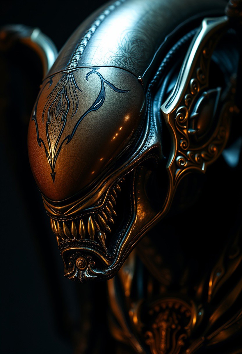 A tight close-up shot employing contrasting chiaroscuro lighting, focuses on the detailed features of a winged Xenomorph human. The baroque style piece showcases intricate marquetry, precious wood inlays, and gilded bronze ornamentation, with strong contrasts and deep shadows.