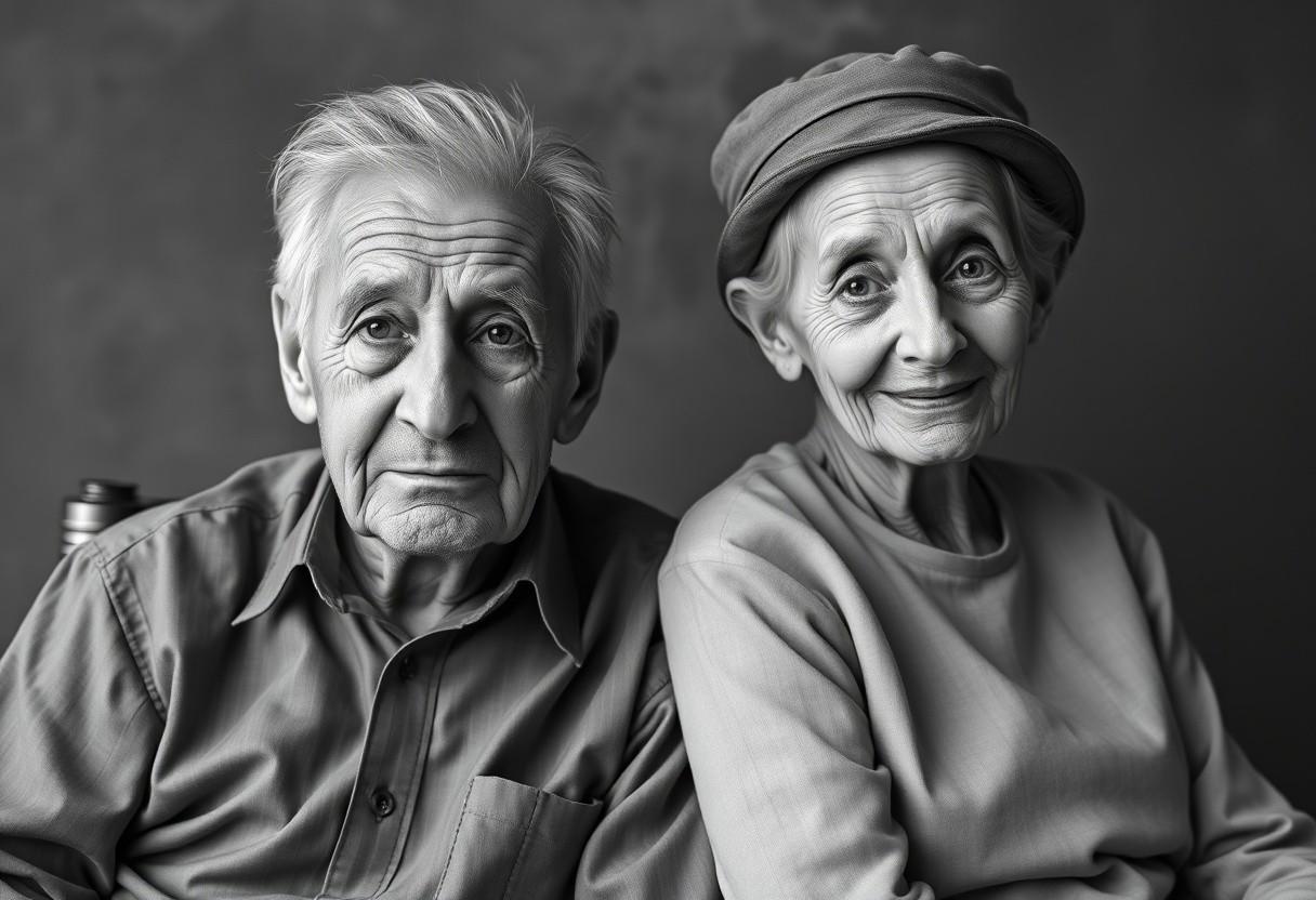 Image caption: Imagine a professional studio black and white portrait image that depicts a woman and a man. The image is of high quality and style of classic photography, with extremely detailed faces, showing the radiance of life fatigue and a sense of wisdom and old age. The Couple: Elderly Man: The man is dressed in simple but elegant clothes, appropriate for his age. He is wearing a long-sleeved shirt and trousers. His face is depicted with extreme precision, showing every wrinkle, skin texture, pores and other small details. His eyes reflect the fatigue of a long life, but also the wisdom accumulated over the years. He sits on a chair and looks at the camera with a warm and calm expression. Elderly Woman: The woman is dressed in a simple but elegant dress. She wears her hair in a modest bun or tucked up with a hat. Her face is depicted in great detail, showing every wrinkle, pores and an expression of tenderness and wisdom. Her eyes radiate life-weariness, but also calmness and strength. She sits next to the man and looks at the camera with a slight smile. Old House: Background Architecture: The house behind the couple is depicted with extreme precision, showing details such as wooden doors and windows, as well as the texture of the walls and roof. The house should convey a feeling of old times and coziness.