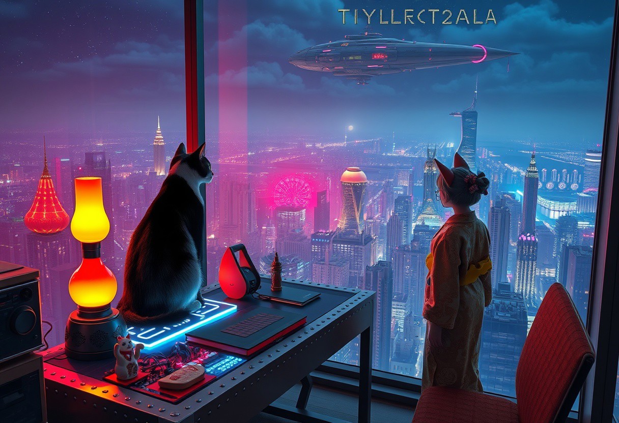 Jiji, the cat from Kiki's Delivery Service sits on a cluttered metal riveted desk with transparent top and rgb led computer components visible inside, On the desk are a maneki neko statue and a lava lamp, Jiji the Cat is looking out of a seamless and Futuristic Art Deco Cyberpunk floor to ceiling window that looks out at a very high view from an apartment on the 400th floor of a futuristic Cyberpunk Art Deco skyscraper, the year is 2250, The Futuristic Art Deco Cyberpunk city has thousands of enormous wide and tall futuristic skyscrapers and space ships covered with lights in the sky, (((Kiki from Kiki's Delivery Service, 24 years old, is standing next to the cat looking out at the enormous city at night, filled with buildings of many shapes and sizes, some over a mile tall))), Kiki is dressed in an ornate Japanese style bath robe. An enormous starship with Futuristic Art Deco Cyberpunk lighting and design is visible high above the city, and a space station is visible in the background among the stars, The woman's hair is messy from just waking up and tied up with a ribbon. Artistic Futuristic Art Deco Cyberpunk designs, dynamic perspective, The focus is on Jiji and Kiki standing together looking out the window at the view together, The entire room is visible and everything has a Futuristic Art Deco Cyberpunk design, sofa, hologram on table displaying news, a small bed,