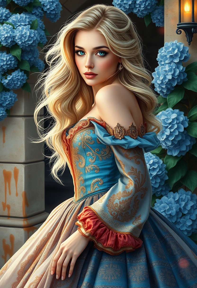 high-fashion realistic real-life intricately-detailed fairytale fantasy dark-romance close-up shot of a blonde gorgeous busty pouty-lipped most beautiful woman on earth Cinderella at a masquerade ball, wearing an elegant intricate blue ballgown, 18yo showing lots of skin, (highly detailed masterpiece Realistic extremely hyper aesthetic) Digital Watercolor Style, Ethereal fluidity painting art style of uses fluid and flowing brushstrokes, creates a sense of movement and lightness, dynamic and abstract composition, professional-grade execution, Image is a book cover with a romantic and historical style, featuring a woman in an elaborate, period-style gown. The dress is a blend of blue and orange hues with intricate patterns, and the woman is positioned in a graceful pose, partially turned to the side. Her skin is fair, and she has long, wavy blonde hair cascading over her shoulders. The background includes architectural elements like a stone archway and lush hydrangea flowers in shades of blue and purple. The overall layout is balanced, with the imagery harmoniously integrated, light-art, lens-flare, magical, spiritual, professional-quality design, dark, chiaroscuro, low-key, stock photo, pro photo, subtle film-grain, 35mm photography