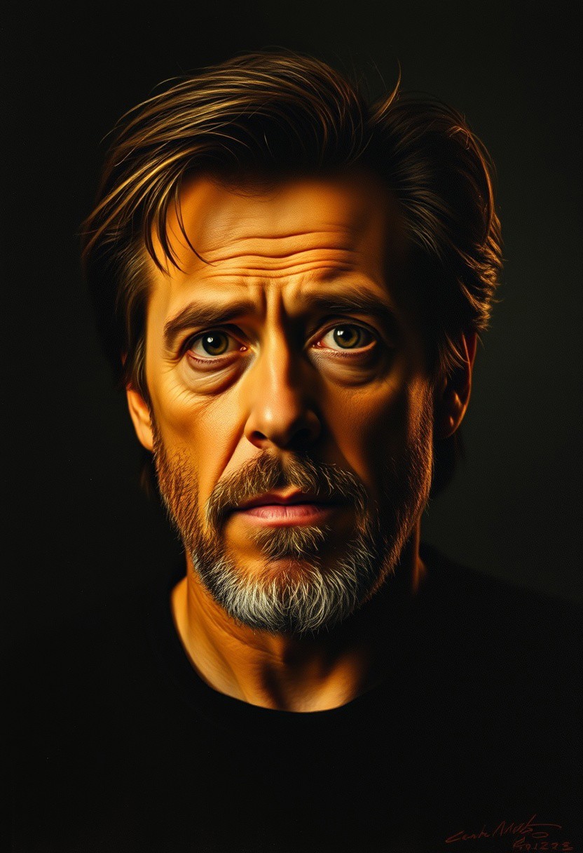 A portrait of jim carrey in the style of Rembrandt van Rijn. Rich, warm chiaroscuro lighting illuminates the subject's face, highlighting the intricate details of their features. Deep, dramatic shadows create a sense of mystery and intrigue. The texture of the canvas should be visible, with visible brushstrokes adding a tactile quality. Jim carrey's expression is contemplative, gazing directly at the viewer with a knowing intensity. A dark, velvet backdrop provides a sense of timeless elegance.
