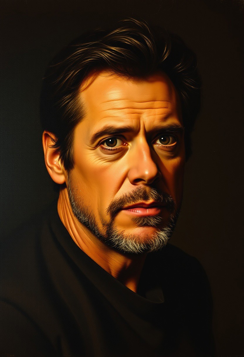 A portrait of jim carrey in the style of Rembrandt van Rijn. Rich, warm chiaroscuro lighting illuminates the subject's face, highlighting the intricate details of their features. Deep, dramatic shadows create a sense of mystery and intrigue. The texture of the canvas should be visible, with visible brushstrokes adding a tactile quality. Jim carrey's expression is contemplative, gazing directly at the viewer with a knowing intensity. A dark, velvet backdrop provides a sense of timeless elegance.