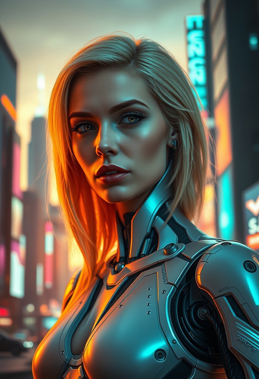 a striking cybernetic blonde woman, stands confidently in a futuristic cityscape at sunset. Soft, even lighting casts a warm glow on her features, accentuating the intricate details of her cybernetic robot attire. Her face, a masterwork of precision and beauty, is framed by medium-length portrait proportions. Eyes gleam with intensity as she surveys the neon-lit metropolis behind her, where towering skyscrapers and holographic advertisements blur into a futuristic haze.