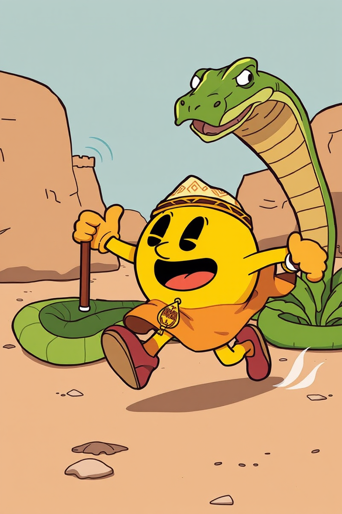 illustration of pacman dressed as a Moroccan snake charmer running away from a big snake, cartoon, detailed,