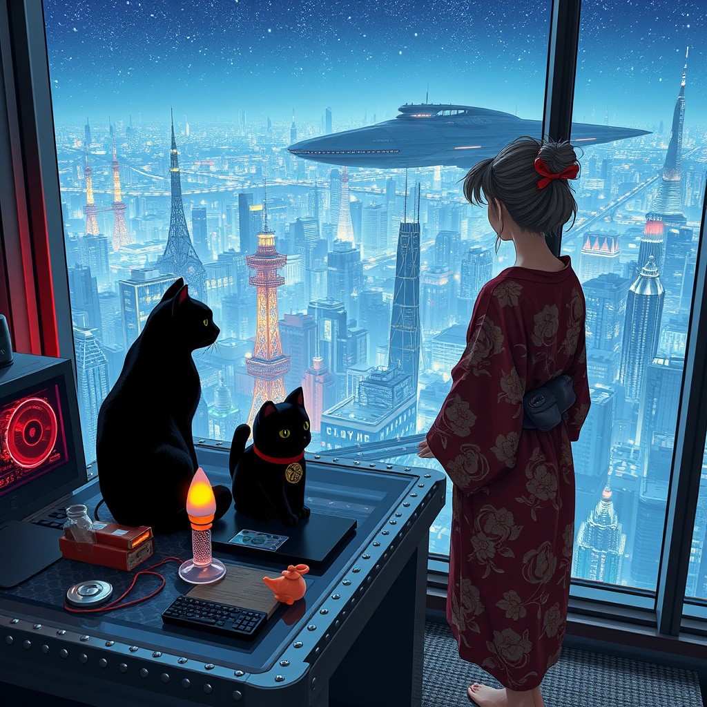 Jiji, the cat from Kiki's Delivery Service sits on a cluttered metal riveted desk with transparent top and rgb led computer components visible inside, On the desk are a maneki neko statue and a lava lamp, Jiji the Black Cat is looking out of a seamless and futuristic floor to ceiling window that looks out at a very high view from an apartment on the 400th floor of a futuristic Tokyo skyscraper, the year is 2250, The city has thousands of enormous wide and tall futuristic skyscrapers and space ships covered with lights in the sky, (((Kiki from Kiki's Delivery Service, 24 years old, is standing next to the cat looking out at the enormous city at night, filled with buildings of many shapes and sizes, some over a mile tall))), Kiki is dressed in an ornate Japanese style bath robe. An enormous starship with futuristic lighting and design is visible high above the city, and a space station is visible in the background among the stars, The woman's hair is messy from just waking up and tied up with a ribbon. Artistic cyberpunk, dynamic perspective, The focus is on Jiji and Kiki standing together looking out the window at the view together, (((overall architectural aesthetic is Art Deco Cyberpunk))). Mt Fuji can be seen in the far distance,