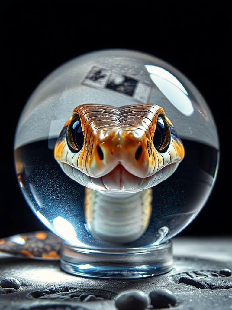 A Cute Snake behind a crystal ball so that the image of the snakes face is distored in a manner similar to a fish eye lens