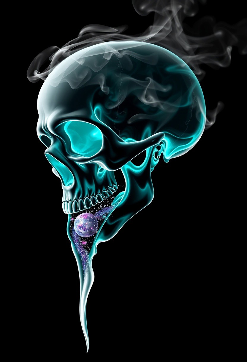 Cybernetic Skull, black background, slhouette black and white outline, skull made of smoke, neon teal_flames, pov sideview, smoke rises from back of skull, whole Galaxy in skull, mouth open pouring out Galaxy in a liquid form