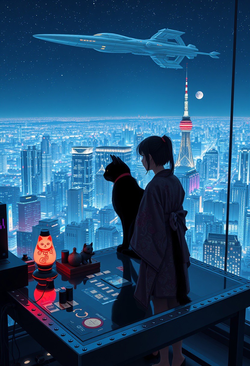 Jiji, the cat from Kiki's Delivery Service sits on a cluttered metal riveted desk with transparent top and rgb led computer components visible inside, On the desk are a maneki neko statue and a lava lamp, Jiji the Black Cat is looking out of a seamless and futuristic floor to ceiling window that looks out at a very high view from an apartment on the 400th floor of a futuristic Tokyo skyscraper, the year is 2250, The city has thousands of enormous wide and tall futuristic skyscrapers and space ships covered with lights in the sky, (((Kiki from Kiki's Delivery Service, 24 years old, is standing next to the cat looking out at the enormous city at night, filled with buildings of many shapes and sizes, some over a mile tall))), Kiki is dressed in an ornate Japanese style bath robe. An enormous starship with futuristic lighting and design is visible high above the city, and a space station is visible in the background among the stars, The woman's hair is messy from just waking up and tied up with a ribbon. Artistic cyberpunk, dynamic perspective, The focus is on Jiji and Kiki standing together looking out the window at the view together, (((overall architectural aesthetic is Art Deco Cyberpunk))). Mt Fuji can be seen in the far distance,