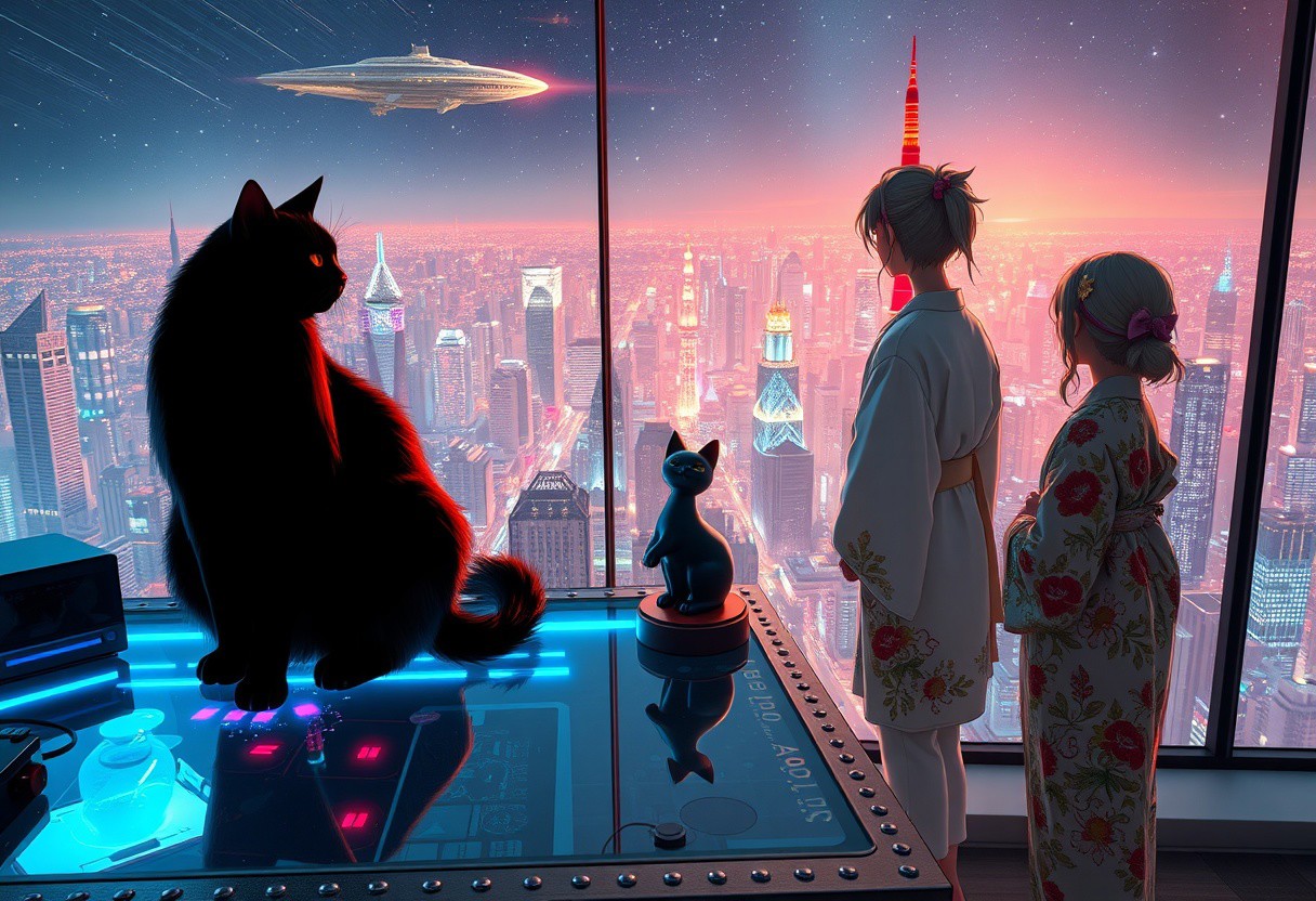 Jiji, the cat from Kiki's Delivery Service sits on a cluttered metal riveted desk with transparent top and rgb led computer components visible inside, On the desk are a maneki neko statue and a lava lamp, Jiji the Black Cat is looking out of a seamless and futuristic floor to ceiling window that looks out at a very high view from an apartment on the 400th floor of a futuristic Tokyo skyscraper, the year is 2250, The city has thousands of enormous wide and tall futuristic skyscrapers and space ships covered with lights in the sky, (((Kiki from Kiki's Delivery Service, 24 years old, is standing next to the cat looking out at the enormous city at night, filled with buildings of many shapes and sizes, some over a mile tall))), Kiki is dressed in an ornate Japanese style bath robe. An enormous starship with futuristic lighting and design is visible high above the city, and a space station is visible in the background among the stars, The woman's hair is messy from just waking up and tied up with a ribbon. Artistic cyberpunk, dynamic perspective, The focus is on Jiji and Kiki standing together looking out the window at the view together, (((overall architectural aesthetic is Art Deco Cyberpunk))). Mt Fuji can be seen in the far distance,