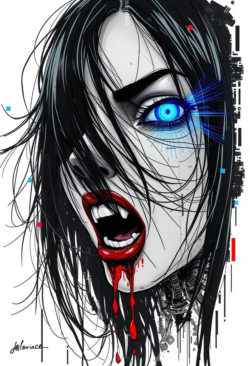 cybernetic style, sci-fi style,masterpiece, <lora:EnvyElegance:1>,<lora:Ultima_Flux_v1:0,5>, <lora:SDXLFaeTastic2400:1>, <lora:sharp_eyes:1>, <lora:EyesWorld:1>, <lora:Sinozick_Style_XL_Pony:1>,A close-up, artistic portrait of a woman with wild, Vampire, bloody fangs, a trickle of blood on his chin, disheveled black hair obscuring parts of her face. One eye is vividly glowing in an intense blue hue, radiating with a subtle, ethereal energy that contrasts against the darker tones. The expression is a mix of anger and menace, with an open mouth hinting at emotional turmoil. The artwork features glitch effects and digital distortions, creating an otherworldly, fragmented aesthetic. The style is bold, with heavy black ink strokes and high contrast, accentuated by abstract visual noise and scratches, emphasizing a chaotic, digital dystopian theme.