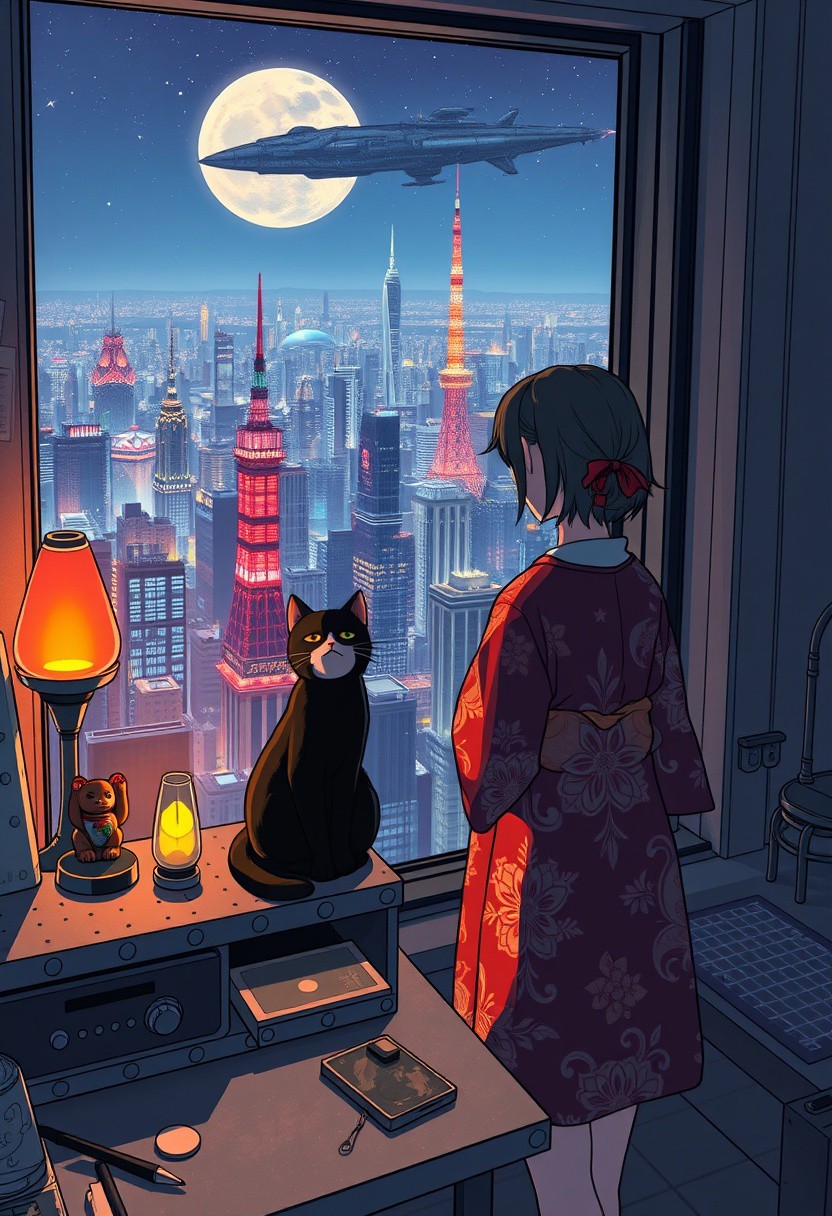 Jiji, the cat from Kiki's Delivery Service sits on a cluttered metal riveted desk next to a maneki neko statue and a lava lamp, Jiji is looking out of a floor to ceiling window that looks out at a very high view from an apartment on the 400th floor of a futuristic Tokyo skyscraper, the year is 2250, The city has thousands of enormous wide and tall futuristic skyscrapers and space ships in the sky, (((Kiki from Kiki's Delivery Service, 24 years old, is standing next to the cat looking out at the enormous city at night, filled with buildings over a mile tall))), Kiki is dressed in an ornate Japanese style bath robe. An enormous starship is visible high above the city, The woman's hair is messy from just waking up and tied up with a ribbon. Artistic cyberpunk, dynamic perspective, The focus is on Jiji and Kiki standing together looking out the window at the view together,
