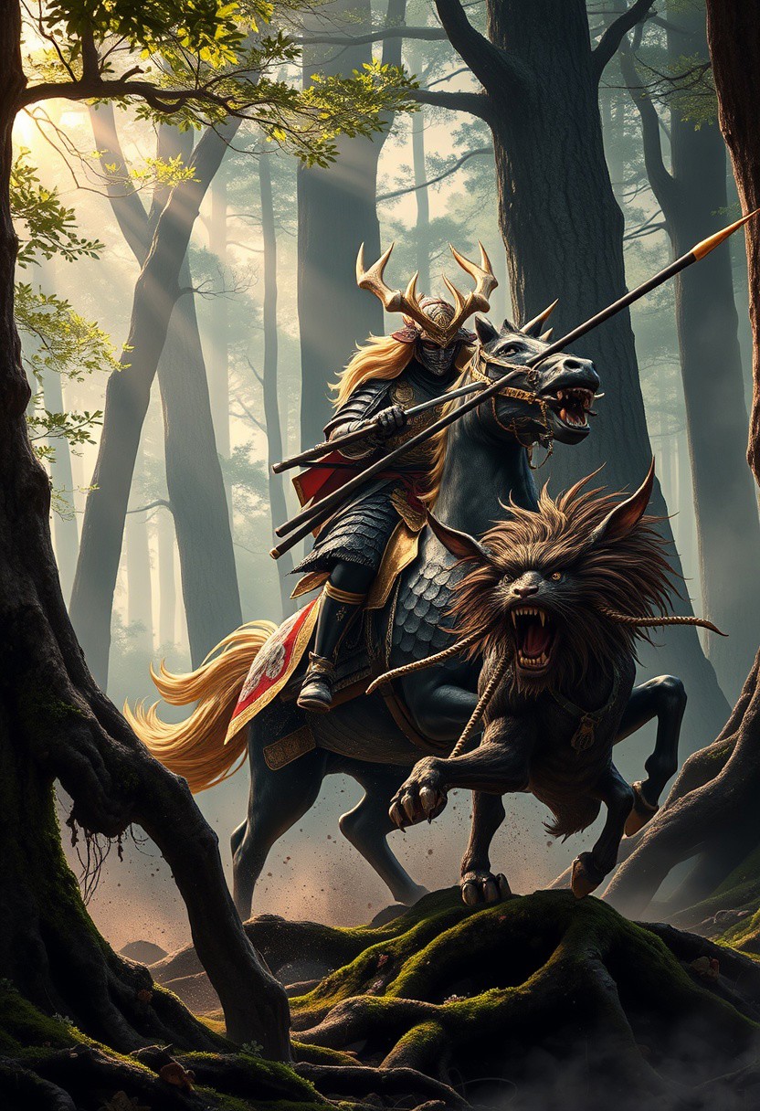 A Samurai in Full Armour with Mask and Swords, ornate, battle-worn armor rides atop a majestic Kirin through a misty Japanese forest. The Kirin’s scales resemble dark lacquer edged with shimmering gold, giving it a regal, polished appearance. Its large, elk-like antlers gleam in gold and silver, catching the dappled sunlight breaking through the dense canopy. The Kirin’s golden mane flows like liquid fire as it charges forward with an aura of divine power. The Samurai, gripping a long Japanese spear (Yari), delivers a decisive strike to a Demonic (hkwarrior) with wild hair and sharp claws, mid-attack. The forest is alive with towering trees, moss-covered roots, and swirling mist, framing the dramatic and mystical battle. Kodama, can be seen peeking from the branches of trees and on the ground,
