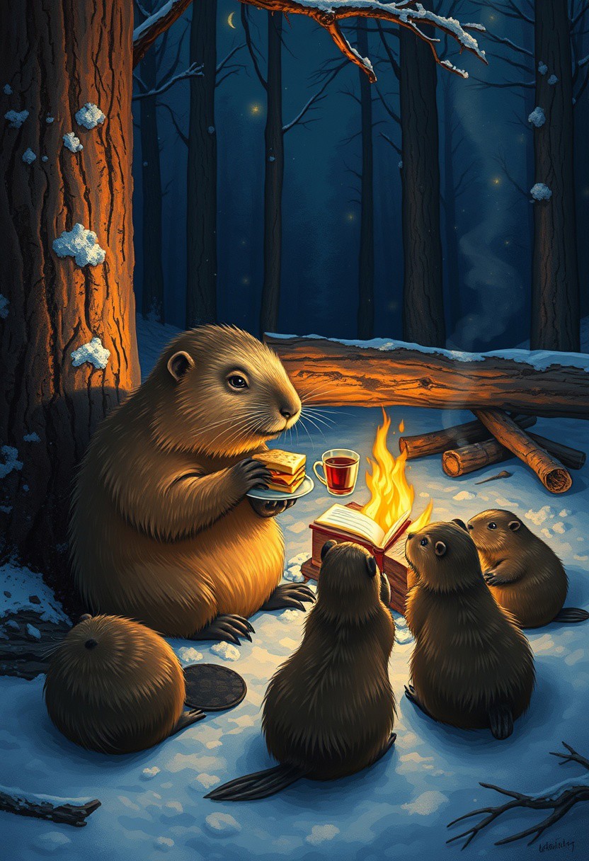 During a dark snowy night a big capybara sits nearby fallen tree next to a big campfire and eats a sandwich with cheese and holds a cup of tea, sits among a group of little beavers. They read a fairy tales book with details, snow, snowy, winter forest, vivid colors, realistic details like seeing under an electron scanning microscope