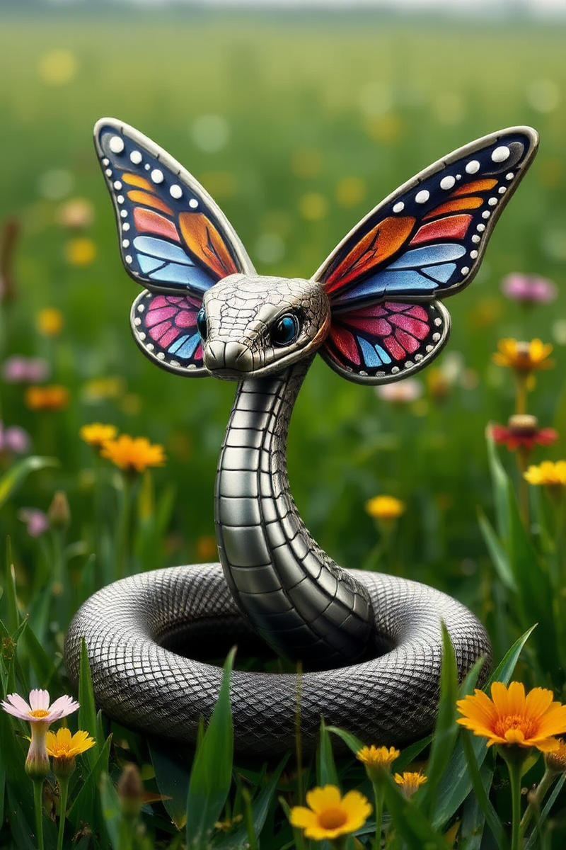 A metal snake with butterfly wings on a lush meadow. High grass, colorful flowers, surreal,