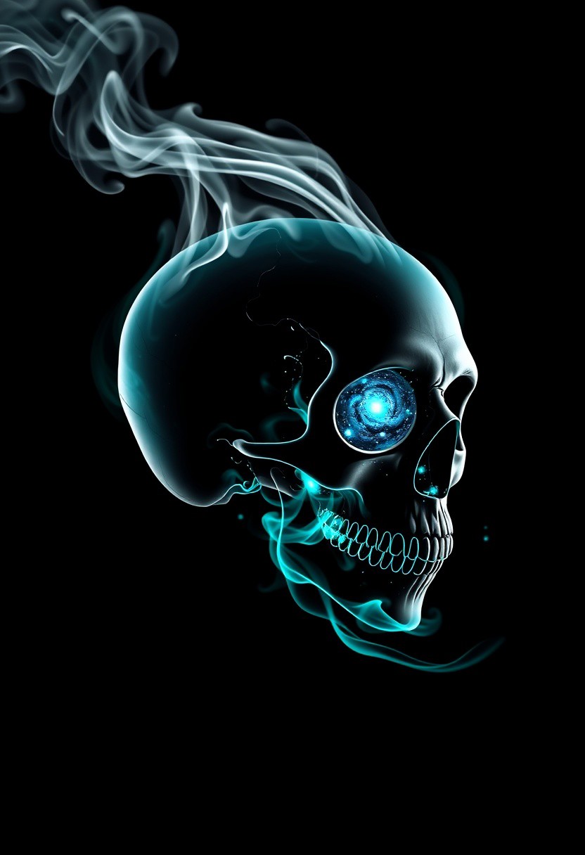 Cybernetic Skull, black background, slhouette black and white outline, skull made of smoke, neon teal_flames, pov sideview, smoke rises from back of skull, whole Galaxy in skull, mouth open pouring out Galaxy in a liquid form