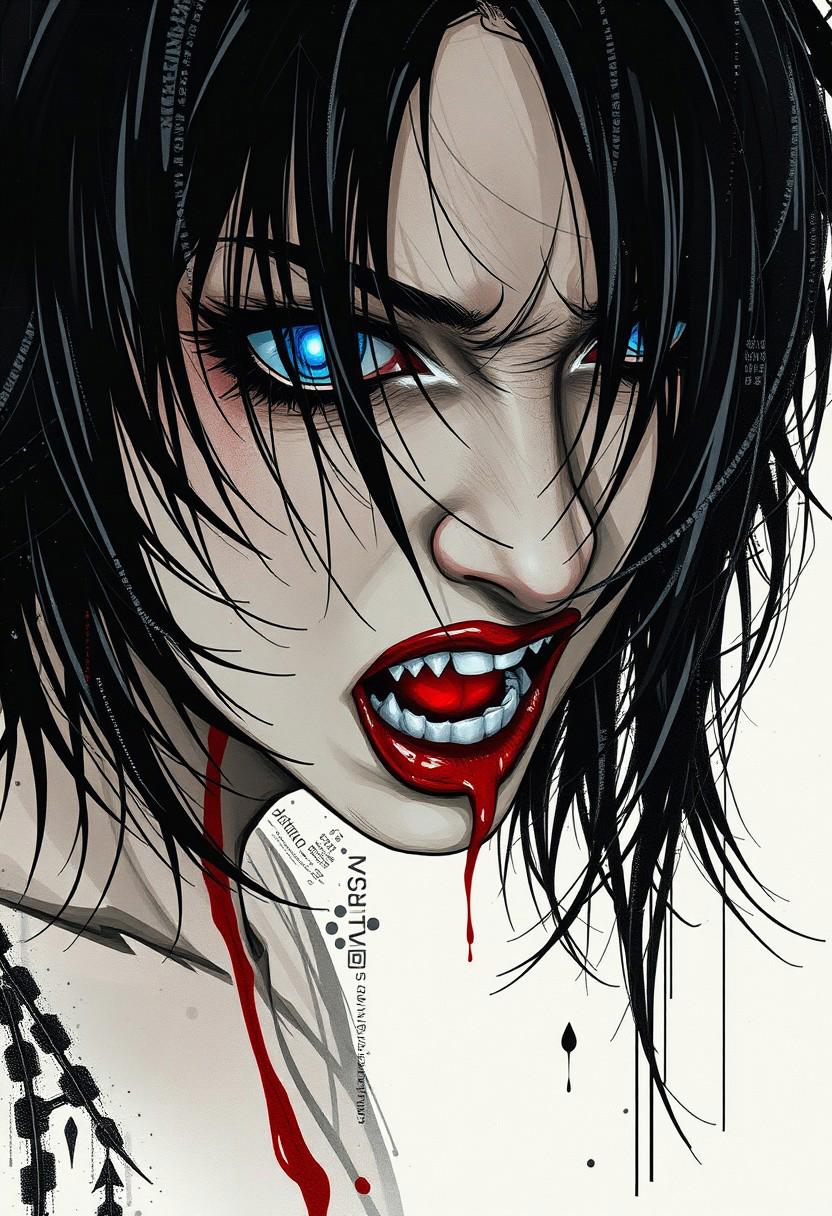 cybernetic style, sci-fi style,masterpiece, <lora:EnvyElegance:1>,<lora:Ultima_Flux_v1:0,5>, <lora:SDXLFaeTastic2400:1>, <lora:sharp_eyes:1>, <lora:EyesWorld:1>, <lora:Sinozick_Style_XL_Pony:1>,A close-up, artistic portrait of a woman with wild, Vampire, bloody fangs, a trickle of blood on his chin, disheveled black hair obscuring parts of her face. One eye is vividly glowing in an intense blue hue, radiating with a subtle, ethereal energy that contrasts against the darker tones. The expression is a mix of anger and menace, with an open mouth hinting at emotional turmoil. The artwork features glitch effects and digital distortions, creating an otherworldly, fragmented aesthetic. The style is bold, with heavy black ink strokes and high contrast, accentuated by abstract visual noise and scratches, emphasizing a chaotic, digital dystopian theme.