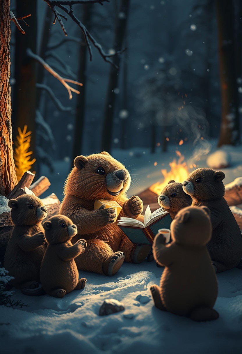 During a dark snowy night a plushie capybara sits nearby fallen tree next to a big campfire and eats a sandwich with cheese and holds a cup of tea, sits among a group of little plushie beavers. They read a fairy tales book with details, snow, snowy, winter forest, vivid colors, realistic details like seeing under an electron scanning microscope