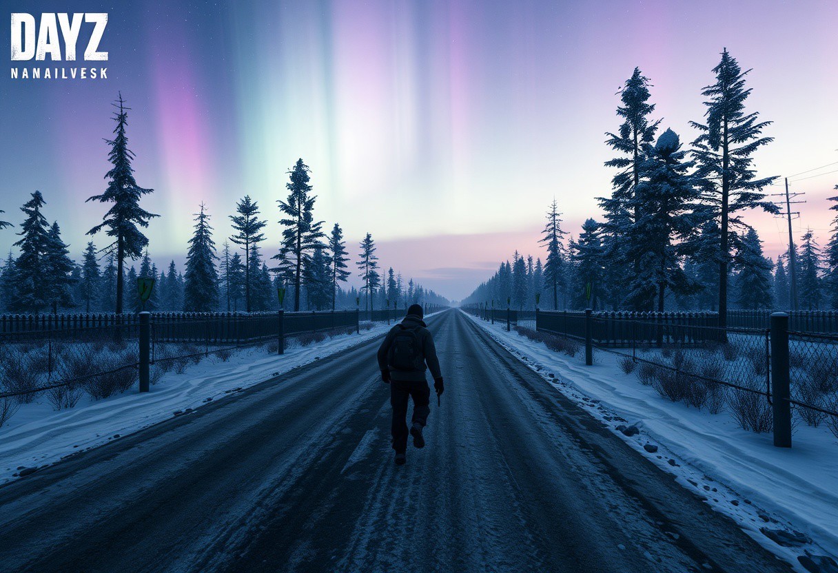 Dayz survivor walking down a road on the map Namalsk. Snow on ground and trees. Aurora in the sky. No text