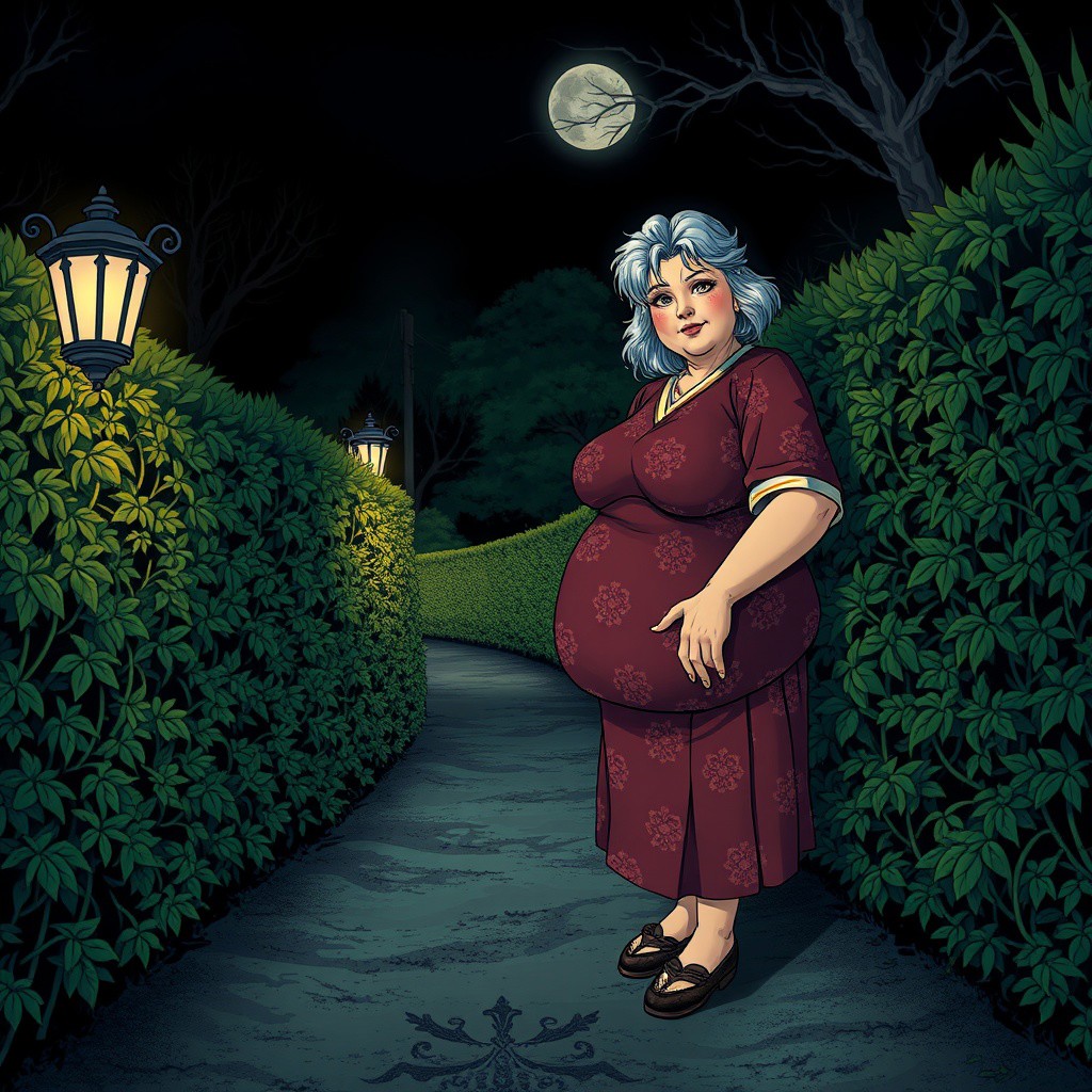 chubby mature woman eerie hedge maze by night dirt path agoura shibari art style of Ozuma Kaname