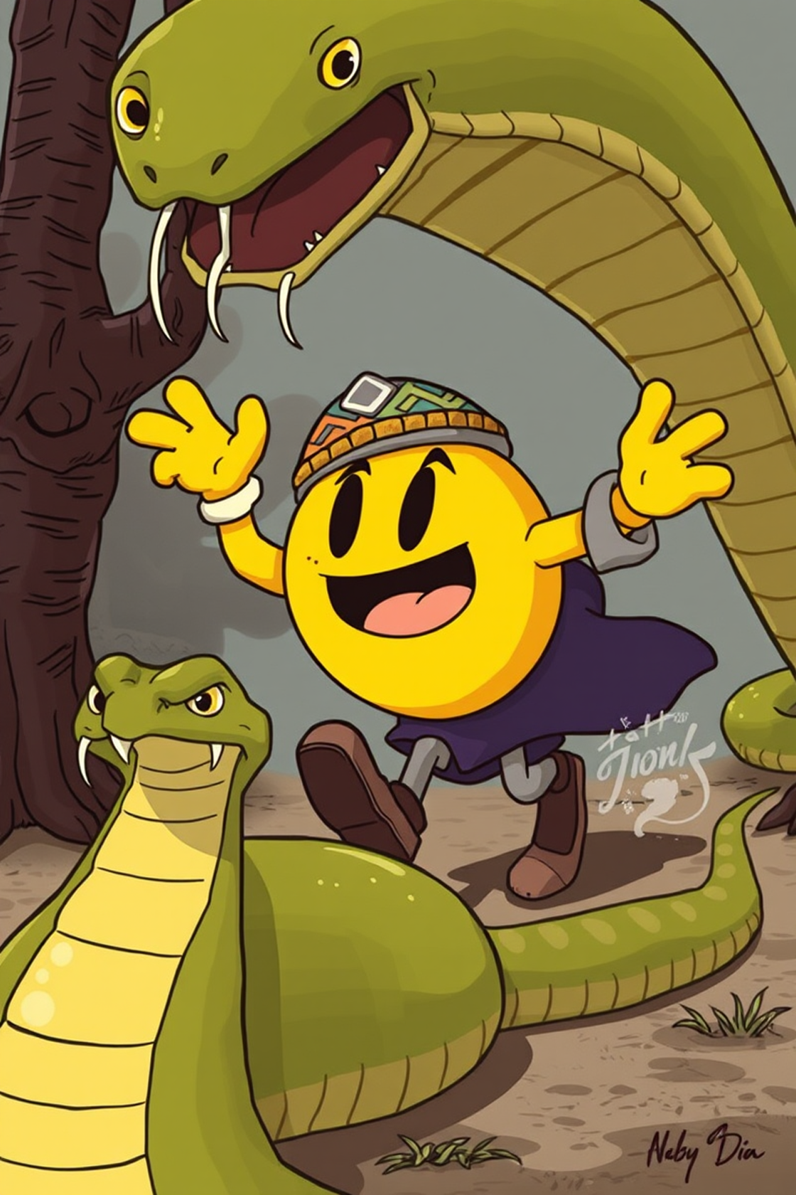 illustration of pacman dressed as a Moroccan snake charmer running away from a big snake, cartoon, detailed,