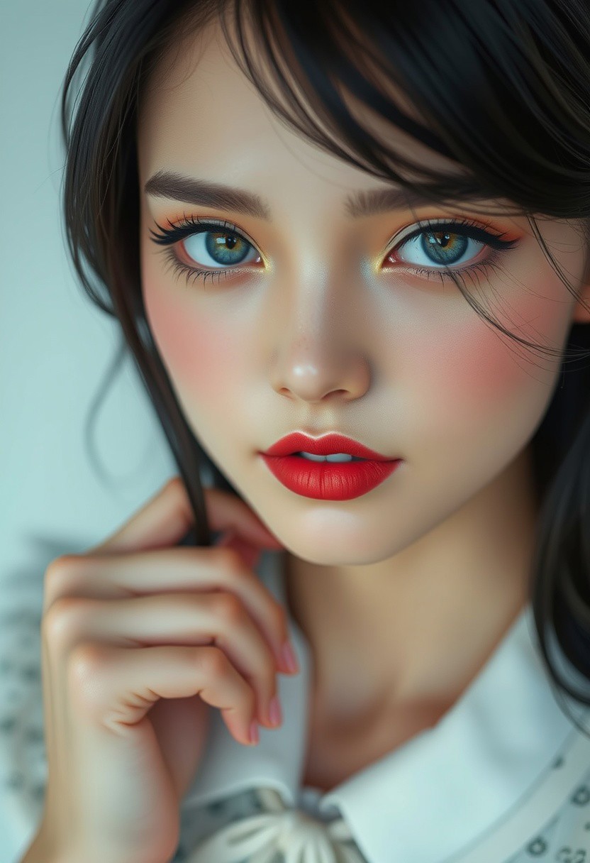 real-life, realistic, photorealistic, 35mm film, photographic, magazine-quality, gorgeous lips, cinematic, (masterpiece), (best quality), (ultra-detailed), very aesthetic, illustration, perfect composition, intricate details, absurdres, detailed face, (anime, masterpiece, intricate:1.3), (beautiful detailed face, beautiful detailed eyes) 1woman, solo, eyeliner, gorgeous lips, black long hair, blue eyes, a mole on the right side of the mouth, a classic shape, ties, thick eyebrows, painted eyelashes, an elegant face