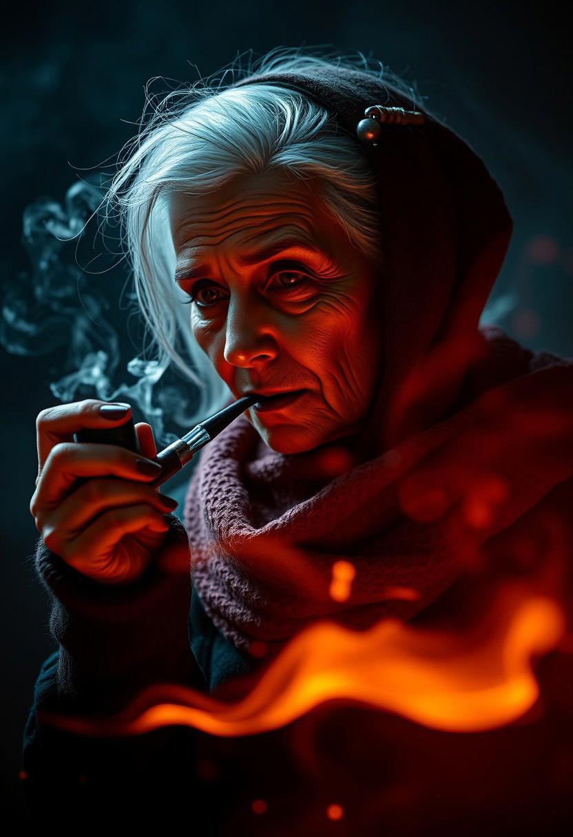 widow style, hiher stule, dark style, cybernetic style, sci-fi style,masterpiece, night, horror, hell, creepy, high noir, brutal, gothic, depts of field, dark techno sci fi fantasy, post nuclear apocalipsys era, dark background, 1female, My grandmother smokes a pipe., swirling ice and fire fog, (best quality:1.1),ultra-detailed, high resolution, super detailed , cinematic, hyperrealistic, (best quality:1.1),ultra-detailed, high resolution, super detailed , cinematic, hyperrealistic, <lora:epi_noiseoffset2:1> , <lora:EnvyDramaticLightingXL02_photo:1> ,<lora:Ultima_Flux_v1:0,5>, <lora:SDXLFaeTastic2400:1>, <lora:sharp_eyes:1>, <lora:EyesWorld:1>, <lora:Sinozick_Style_XL_Pony:1>, futuristic, technological, alien worlds, space themes, advanced civilizations, ,subsurface scattering, Photorealistic, Hyperrealistic, High Detail, film photography, lens flare ,