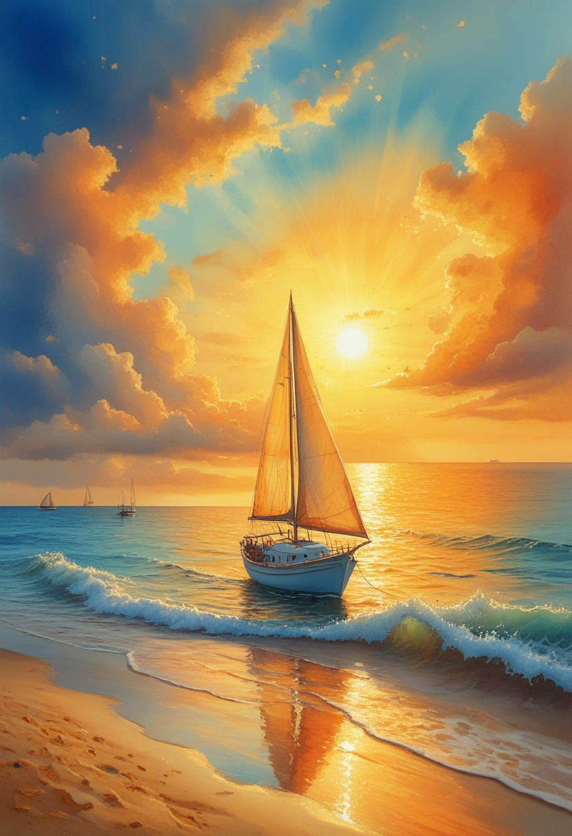 watercolor painting sunset, high tide, golden sand, calm sea, colored clouds, rays of light break through the clouds, in the reflection of light on the water, a sailing boat is a fish, the sea shimmers with bright colors . vibrant, beautiful, painterly, detailed, textural, artistic, midjourneyv6.1