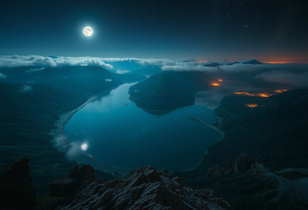 POV, on top of a mountain, looking down from mountain top, geological basin at the base of mountain, rivers leading to basin from mountains, basin surrounded by mountains, shore line, trees, clear blue water, cloud streams, mist over basin, at night, dark, moon, moon light, 3 small glowing orbs in air around basin, 3 small glowing orbs under water surface, stars, night sky, nebula, moons in sky, glowing in the forest, orange glow,