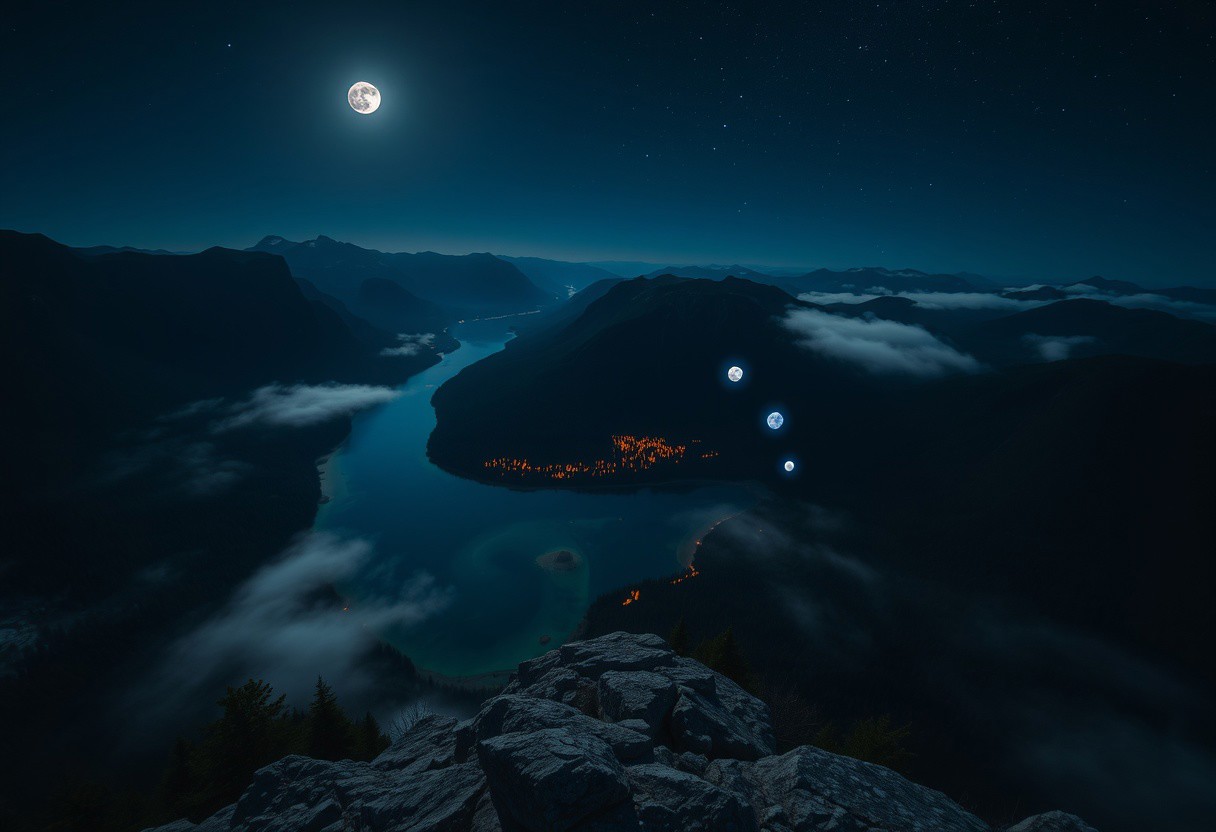 POV, on top of a mountain, looking down from mountain top, geological basin at the base of mountain, rivers leading to basin from mountains, basin surrounded by mountains, shore line, trees, clear blue water, cloud streams, mist over basin, at night, dark, moon, moon light, 3 small glowing orbs in air around basin, 3 small glowing orbs under water surface, stars, night sky, nebula, moons in sky, glowing in the forest, orange glow,