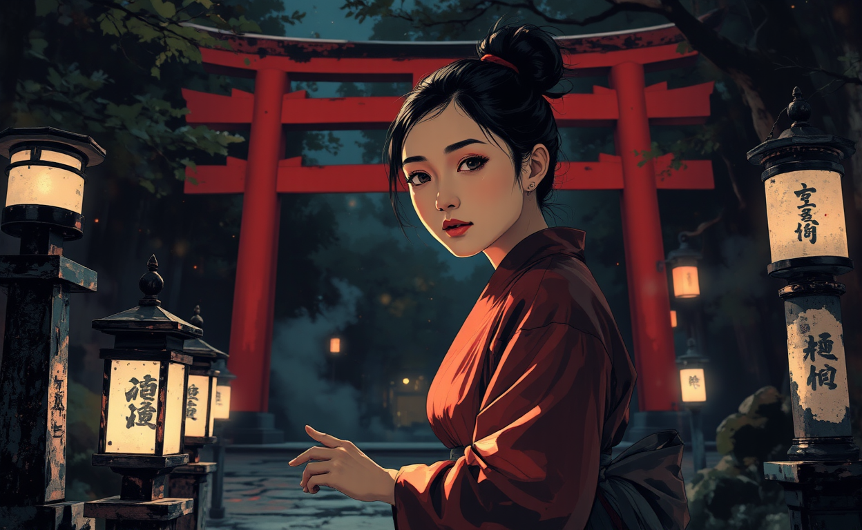 A close-up nighttime scene blending photorealism with the elegance of Japanese brush painting. A Shinto shrine maiden (miko) is cleaning near a traditional red torii gate, her face brightly illuminated to highlight her calm and focused expression. She wears a classic red and white outfit, with intricate details captured in the fabric. Traditional stone lanterns nearby cast a warm glow, their light reflecting softly on her face and the stone path. The background is subtly blurred, showing hints of the majestic torii gate, swaying trees, and faint mist, creating an intimate yet mystical atmosphere. The composition emphasizes the maiden's serene presence and the artistic harmony of the scene.