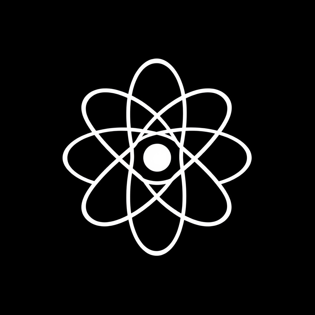 (stylized logo, emblem, vector art), (schematic representation of an atom), (solid colors, thick-linework), white outline, black background, atom symbol white in the center, heraldic, black background, HDR, UHD,