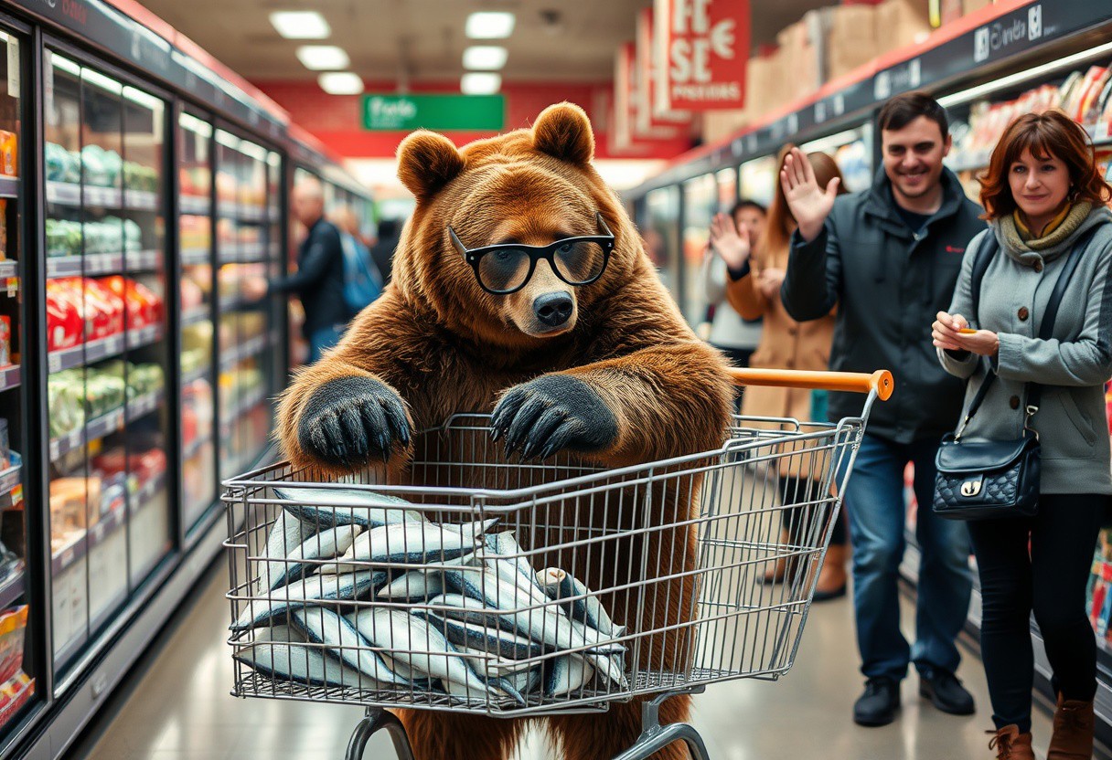 score_9, score_8_up, score_7_up, realistic, photo, high quality, extreme detail, photogenic, (((photorealistic))), best quality, realistic lighting, source_photo, a brown bear is in a grocery store pushing a shopping cart, the bear is putting frozen fish into its shopping cart, the shopping cart is full of fish, other grocerie shoppers are waving at the bear, the bear is wearing Groucho glasses, beaglepuss, the other shoppers think the beare is a fellow human because if its disguise, funny, goofy, a little stupid and probably slightly artistic,