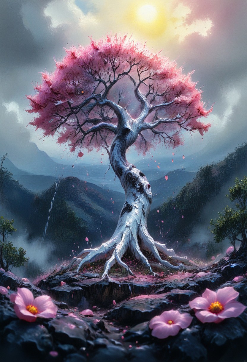 watercolor painting, sSurreal, anime style, hills, sprawling black and white tree, pink petals, sun, maximum details, dynamic, great lighting, perfect shading, atmospheric, best quality, sharp focus, high contrast, stylized, clear, surreal, ultra quality , 8k, best quality, masterpiece, textural, artistic, midjourneyv6.1, cube, surr, cube impression, vivid color, Colorful Chaos Cracks and Drops, Tree