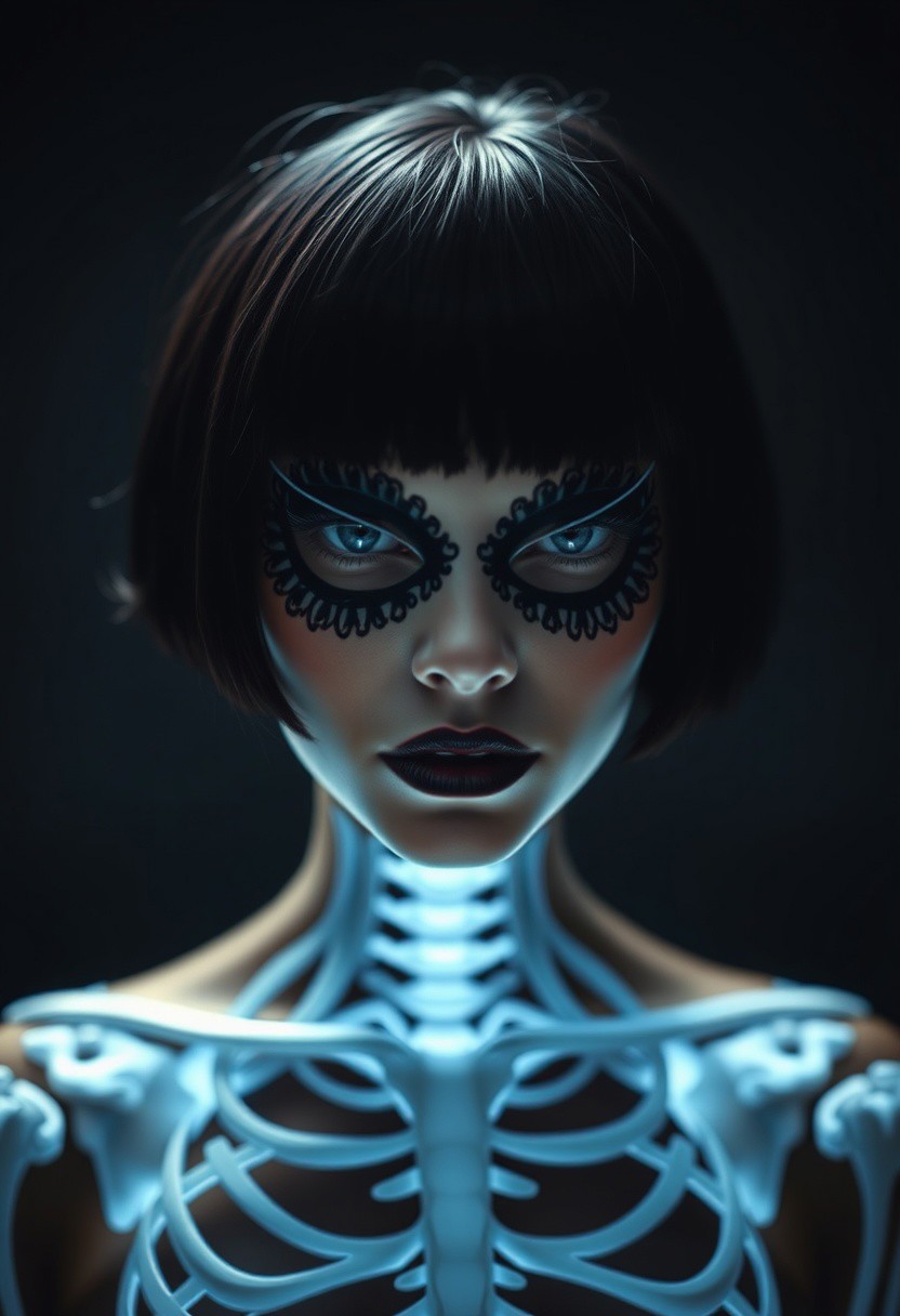 Avant garde, three-quarter view, portrait of an 18-years-old girl, fair skin, dark makeup, dark red lipstick. black bob. Simmetrical, mask shaped, pattern filigree black paint around her eyes. Her body is that of a bioluminescent skeleton. A spotlight illuminates her face