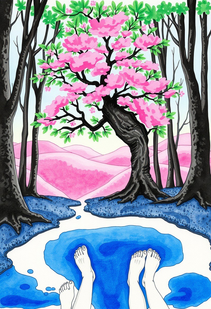 masterpiece, best quality, (realistic:0.35), traditional media, watercolor /(medium/), blue blob, blue puddle, blue oil, multiple feet, blue background, pink theme, outdoors, tree, forest, pink tree, hills