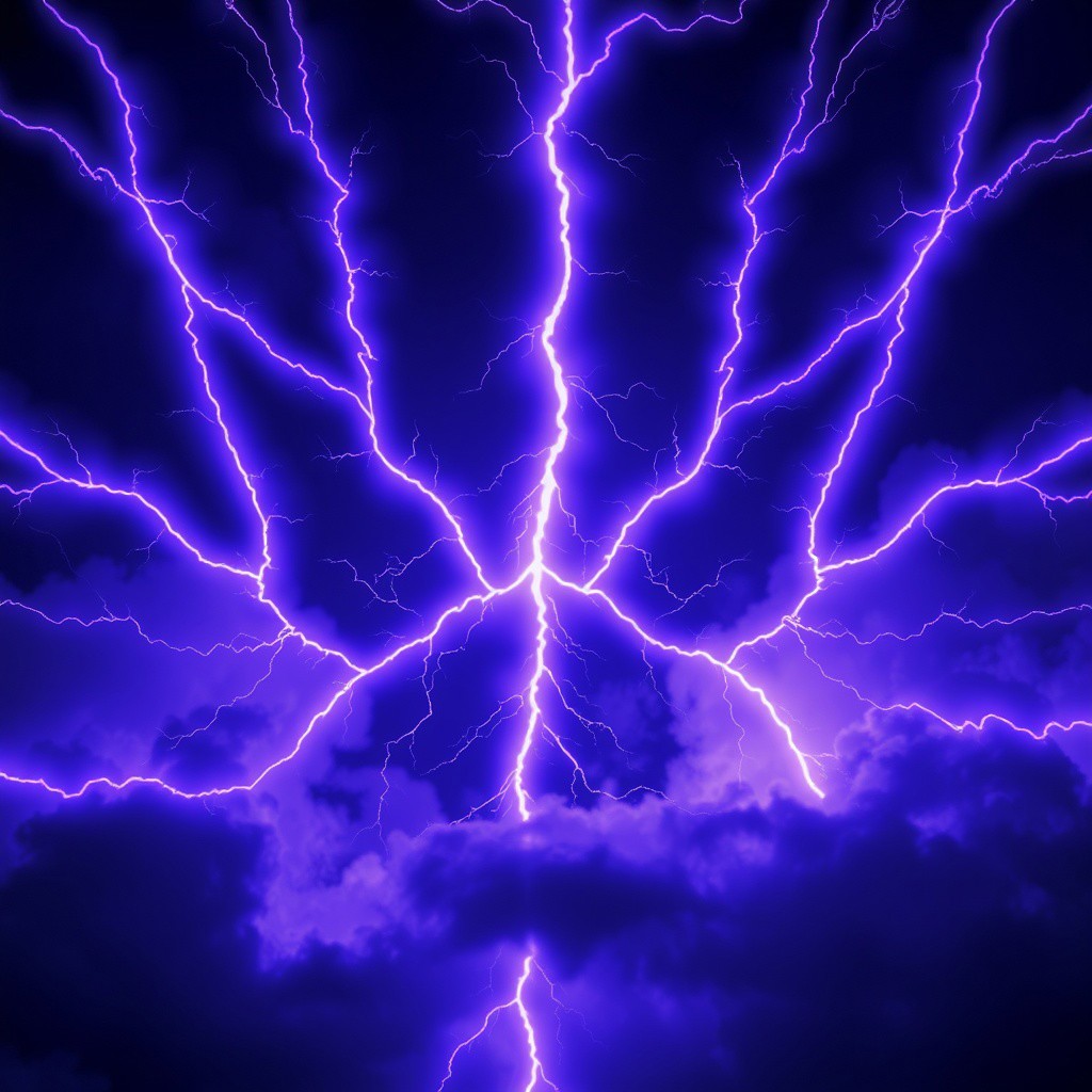 a neon purple glowing lightning fractal pattern shoots across a dark cloudy sky