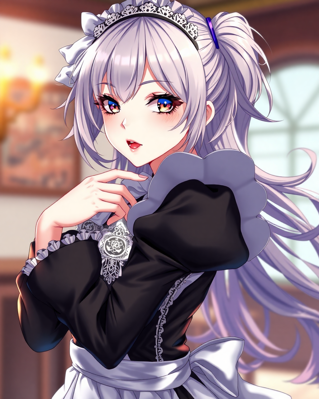 Highly detailed, anime-style girl, beautiful face, smooth porcelain skin, vivid lipstick, perfect makeup, alluring expression, sexy pose, wearing a classic maid outfit with intricate lace details, black and white contrast, elegant and stylish design, soft lighting, background blurred to enhance focus on the character, highly detailed fabric textures, dynamic and flowing hair, vibrant colors