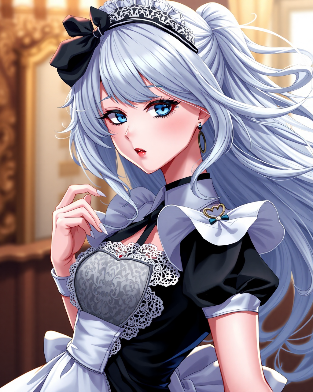 Highly detailed, anime-style girl, beautiful face, smooth porcelain skin, vivid lipstick, perfect makeup, alluring expression, sexy pose, wearing a classic maid outfit with intricate lace details, black and white contrast, elegant and stylish design, soft lighting, background blurred to enhance focus on the character, highly detailed fabric textures, dynamic and flowing hair, vibrant colors