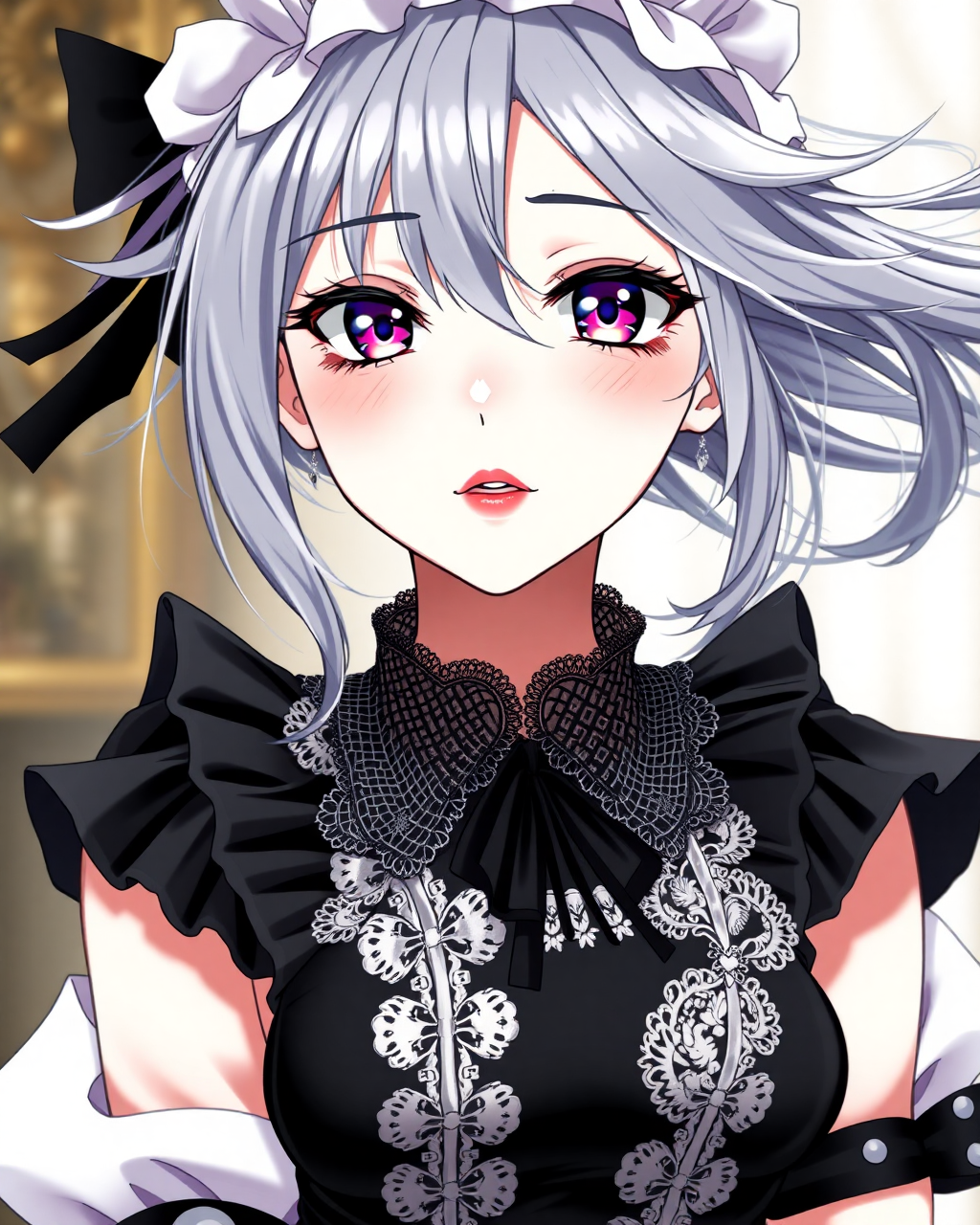 Highly detailed, anime-style girl, beautiful face, smooth porcelain skin, vivid lipstick, perfect makeup, alluring expression, sexy pose, wearing a classic maid outfit with intricate lace details, black and white contrast, elegant and stylish design, soft lighting, background blurred to enhance focus on the character, highly detailed fabric textures, dynamic and flowing hair, vibrant colors