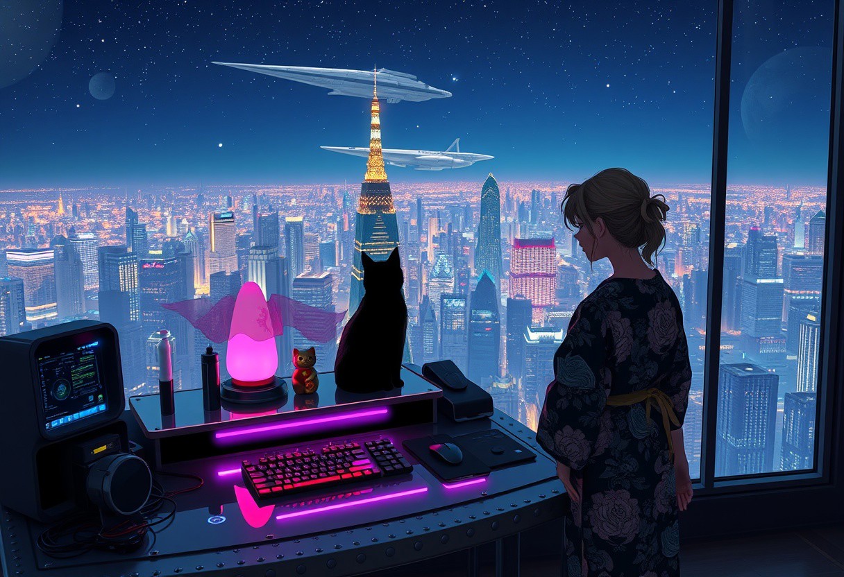 Jiji, the cat from Kiki's Delivery Service sits on a cluttered metal riveted desk with transparent top and rgb led computer components visible inside, On the desk are a maneki neko statue and a lava lamp, Jiji the Black Cat is looking out of a seamless and futuristic floor to ceiling window that looks out at a very high view from an apartment on the 400th floor of a futuristic Tokyo skyscraper, the year is 2250, The city has thousands of enormous wide and tall futuristic skyscrapers and space ships covered with lights in the sky, (((Kiki from Kiki's Delivery Service, 24 years old, is standing next to the cat looking out at the enormous city at night, filled with buildings of many shapes and sizes, some over a mile tall))), Kiki is dressed in an ornate Japanese style bath robe. An enormous deco starship with futuristic lighting and design is visible high above the city, and a space station is visible in the background among the stars, The woman's hair is messy from just waking up and tied up with a ribbon. Artistic cyberpunk, dynamic perspective, The focus is on Jiji and Kiki standing together looking out the window at the view together, (((overall architectural aesthetic is Art Deco Cyberpunk))). Mt Fuji can be seen in the far distance,