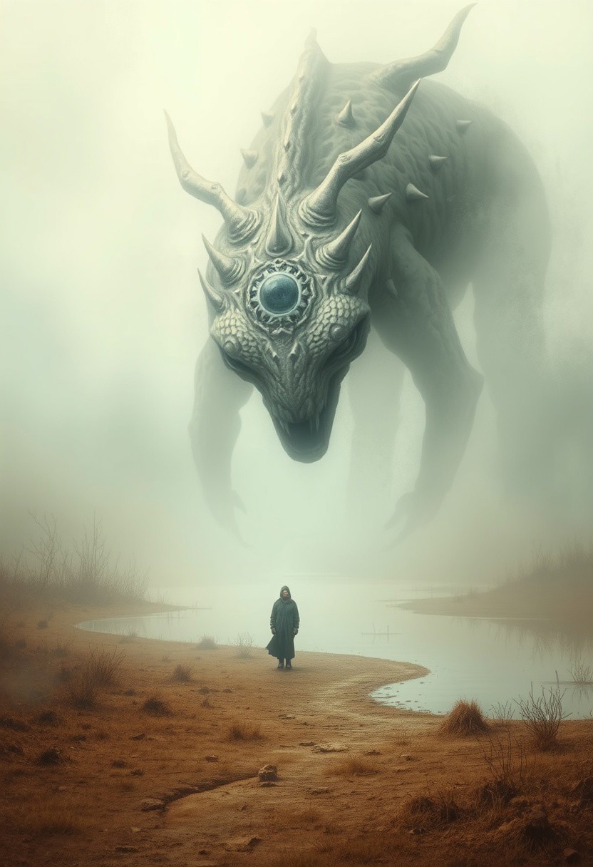 A soft pastel color image of a monster with high contrast and low-key lighting. The image features a dreamlike atmosphere, muted earthy tones, a soft palette, rural landscapes, solitary figures, serene water scenes, a blend of abstraction and realism, textured surfaces, ethereal light, a poetic, meditative style, and deep shadows.